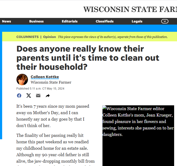 I recently came across the following article “Cleaning out parents' home was a lesson in gratitude and selflessness” by Colleen Kottke in the Wisconsin State Farmer and it gave me pause to reflect on the way my own—currently estranged—children seem to believe they know everting about me and their mother, but in actuality they know very little about who we really are, what we really believe or how our thoughts and opinions are an ever evolving landscape as we grow and learn new things—yes, even in our sixties!