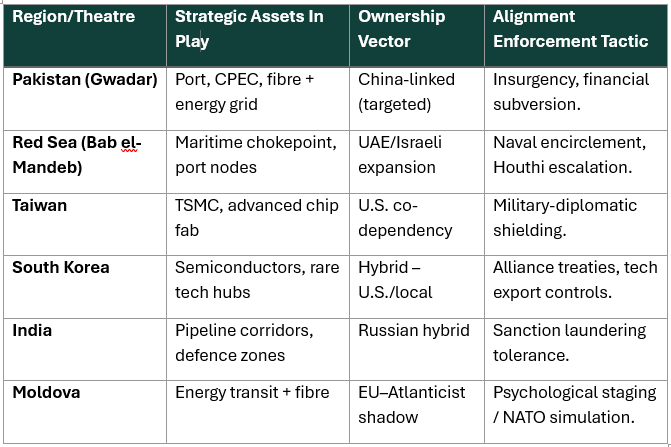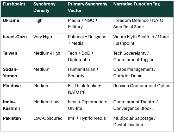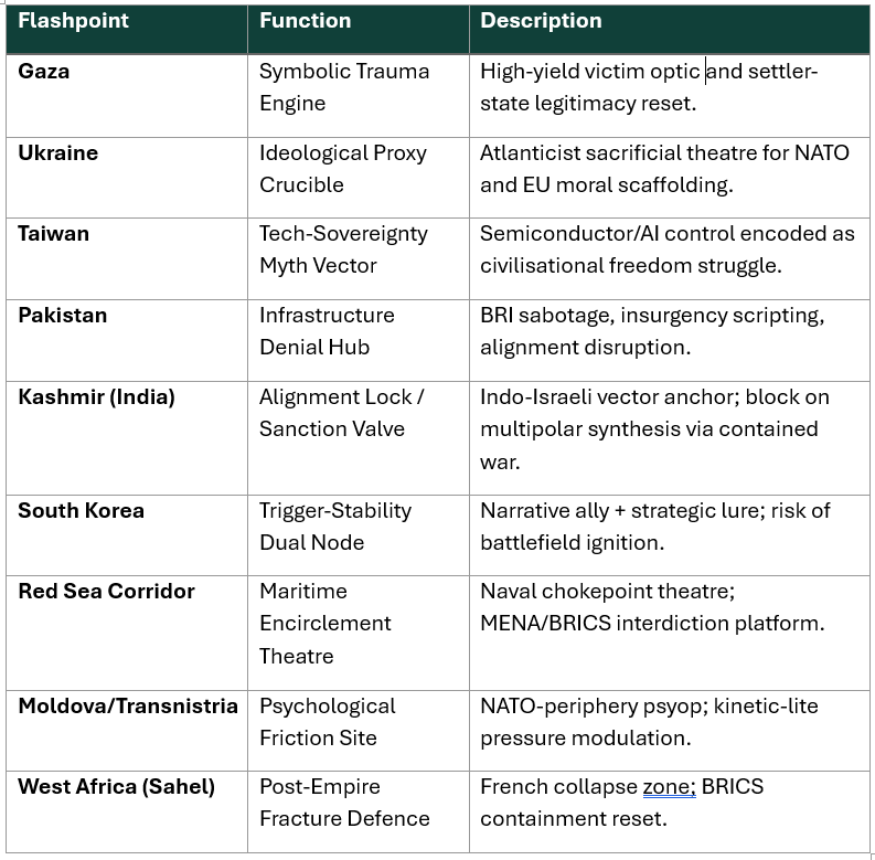 Flashpoints are not accidental—they are activated. Each theatre serves more than territorial aims: it delivers symbolic messaging, narrative conditioning, and strategic disruption. These are not spontaneous conflicts—they are calibration tools. A breakdown of key scripted vectors follows: