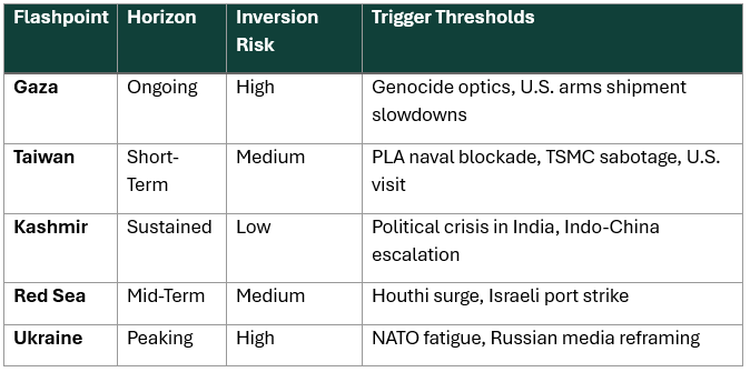 Together, these tables form a multi-vector visibility grid—not of where wars erupt, but of how and when they are authored. Each flashpoint operates inside a converged scripting ecosystem. These schematics expose intensity thresholds, narrative fatigue zones, and anticipatory ignition vectors.