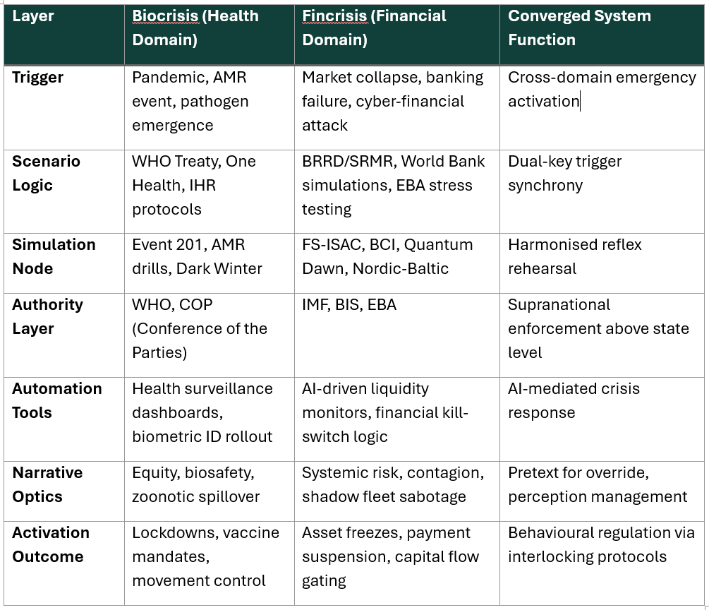 Each domain provides pretext for activating the other. A health emergency enables financial override. A financial disruption legitimises biosecurity enforcement. Together, they form a dual-trigger mechanism—one that has been rehearsed in simulations, embedded in treaty structures, and increasingly governed through automated command platforms. What follows maps this convergence—not as theoretical alignment, but as operational design.