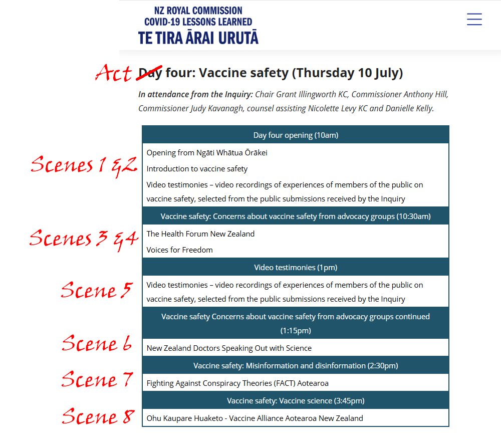This article does not attempt a general critique of the Royal Commission. It examines Day Four alone as a self-contained discursive production—a state-sanctioned play in eight scenes. Through this dramaturgical lens, we expose how expert voices were selected, framed, and sequenced not to test hypotheses but to reassert narrative control. We show how dissent was softened by procedural civility, then epistemically disqualified. And we trace how official science, embodied in figures like Prof Graham Le Gros, returned at day’s end not to answer questions, but to close the interpretive frame.