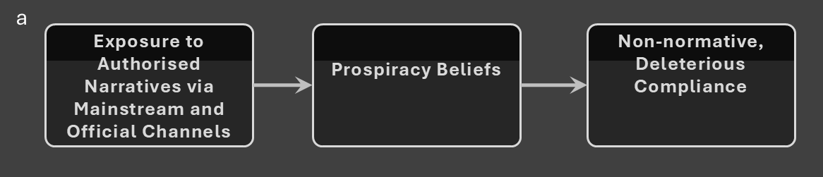 - The standard causal model (from “misinformation → conspiracy → deviance” to “authorised narratives → prospiracy → harmful compliance”) (cf. Lewandowsky et al., 2022).