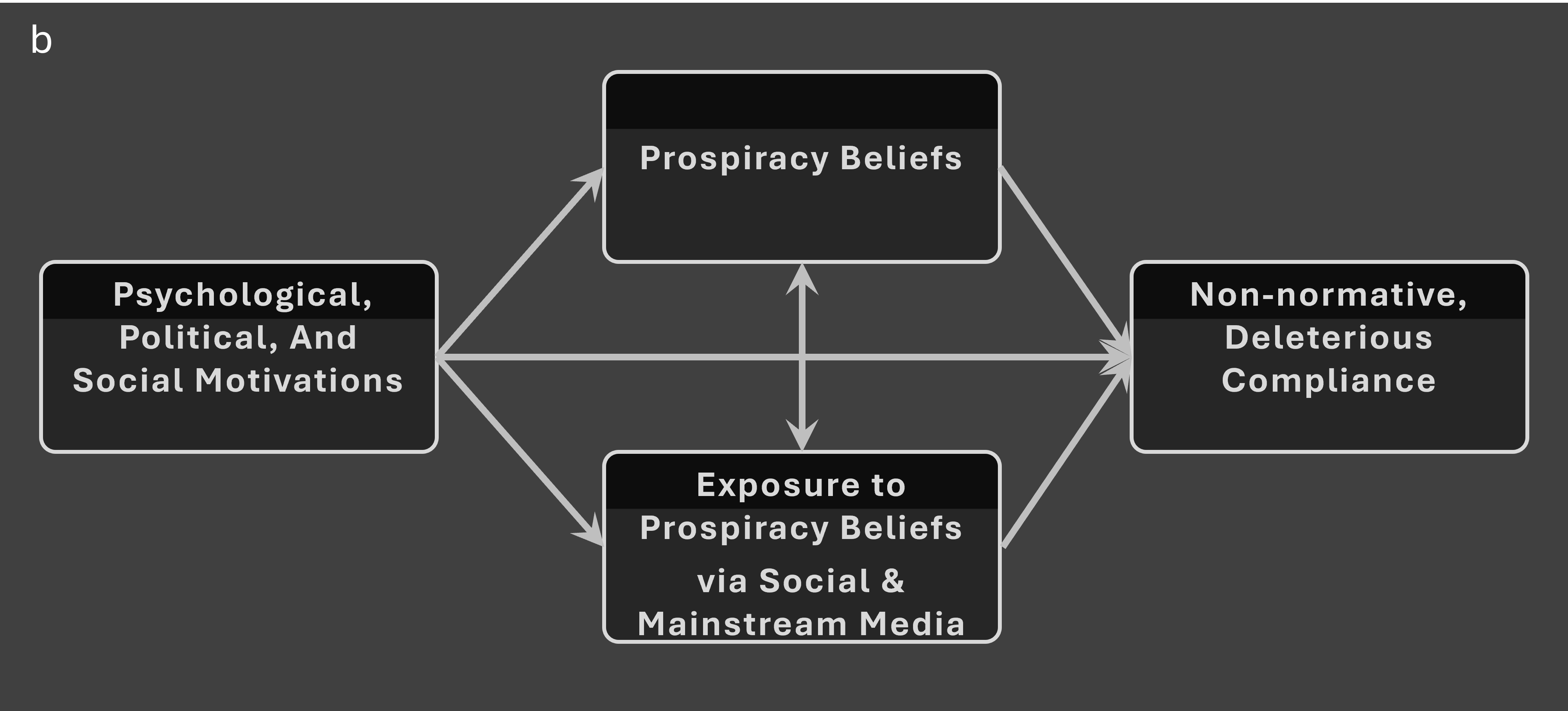 The extended prospiracy model (Figure b) adds psychological, political, and social motivations that feed into both exposure and belief: desire for order and stability, identity as a “reasonable, pro-science, pro-institution” citizen, and social or professional incentives to align with prestigious sources (Douglas, 2021; Howard, 2025b, 2025c).