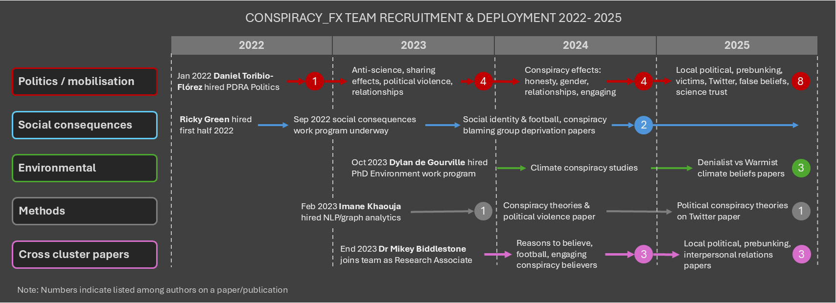 The program truly hit its straps after the ERC grant enabled Douglas et al. to form CONSPIRACY_FX. This was the critical capital injection that transformed a scattered research agenda into a centralised production franchise. The grant provided the mechanism to industrialise the process—no longer funding individual studies, but financing an integrated supply chain for the “conspiracy theorist” category. This pivot is visible in the concrete architecture of the build-out: the timed hires, the segmented work-packages and the scheduled mass-production of outputs.
