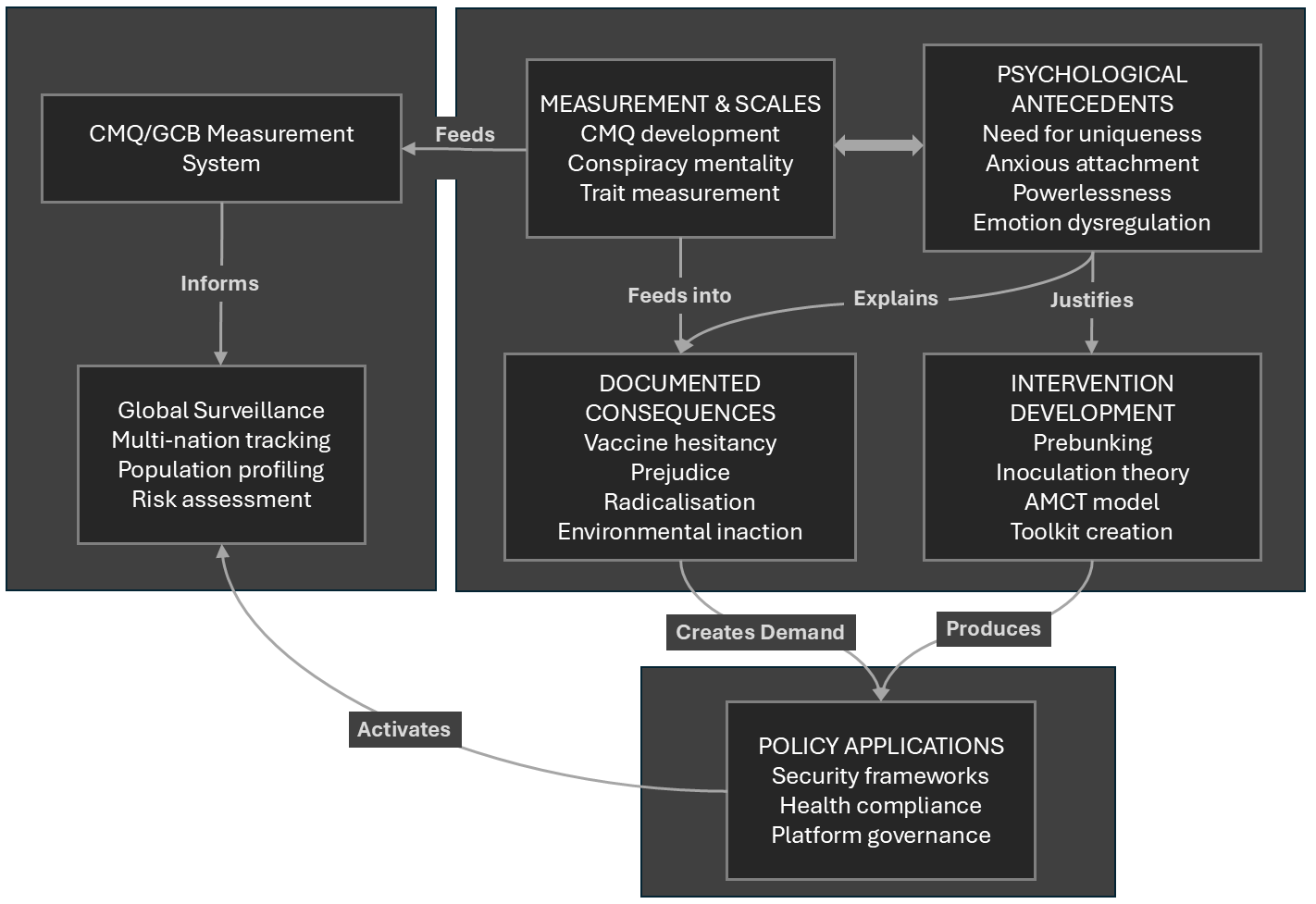- Pathologise: To transform legitimate political and social distrust from a reasoned position into a diagnosable psychological pathology—a “mentality”—using standardised metrics (CMQ/GCB). This is primarily achieved through prestige science funding (ERC, ARC), which lends the process academic legitimacy and scale.