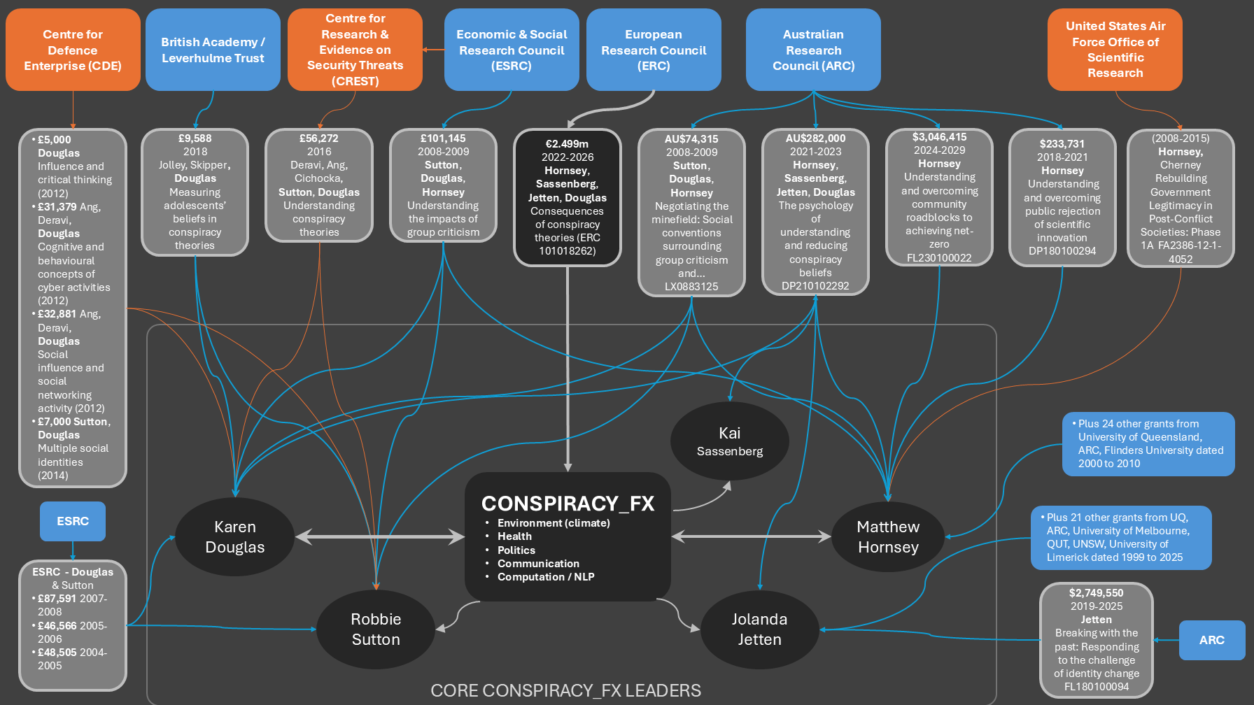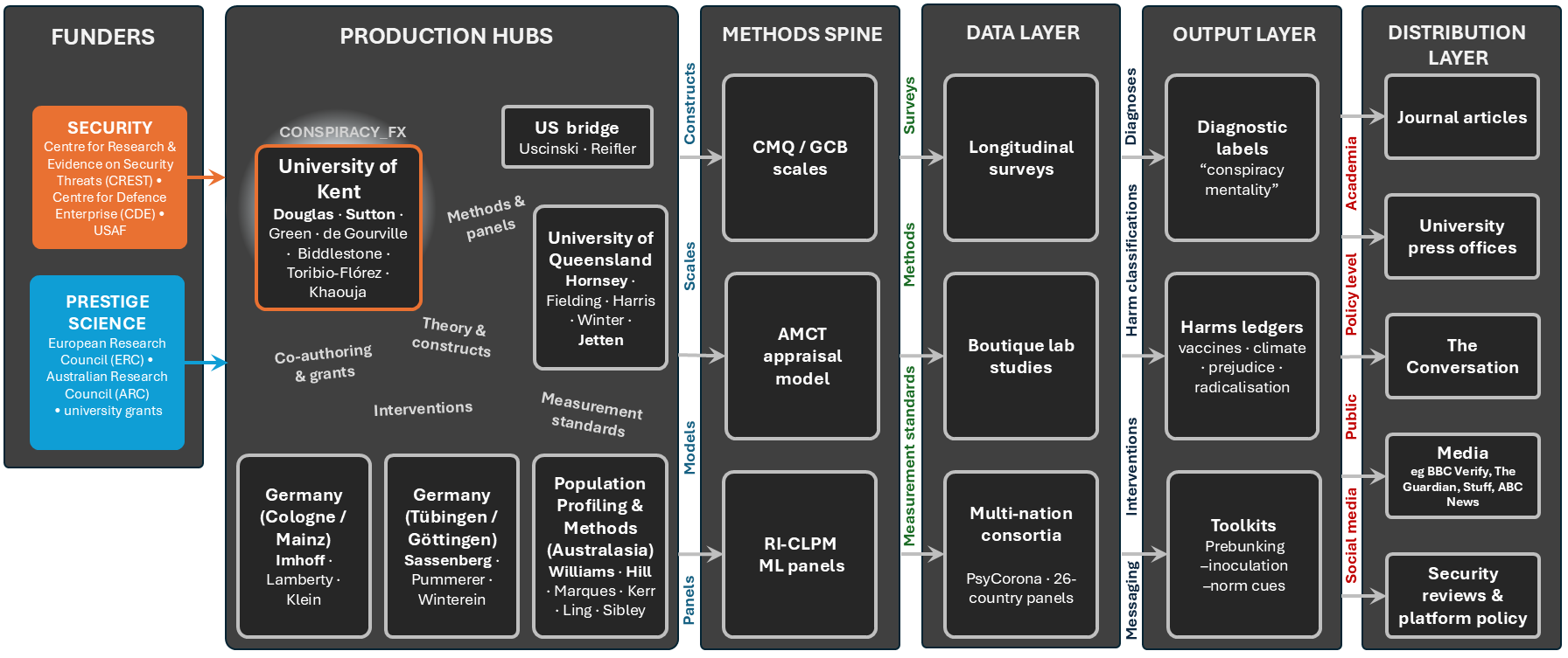 Digging into the structures around CONSPIRACY_FX and two of its principal actors—Professor Karen Douglas (University of Kent) and Australian collaborator Professor Matthew Hornsey (University of Queensland)—we see funding as the starter motor for an academic paper mill that constructs “conspiracy theorists” and “conspiracy mentality” as public-order risks through staged production. From the grants published on their web pages, two streams dominate: security patrons (CREST, CDE, USAF) and prestige science councils (ERC, ARC, ESRC). As far as CONSPIRACY_FX and its associates are concerned, Kent and Queensland carry the funding load; German groups at Tübingen/Göttingen and Cologne/Mainz form the methods spine; a U.S. bridge converts the constructs into political-behaviour frames. These hubs manufacture measures and models, run studies and assemble policy-ready outputs—diagnostic labels, harms ledgers and intervention toolkits—which are then relayed through press offices, The Conversation and platform or security briefs.