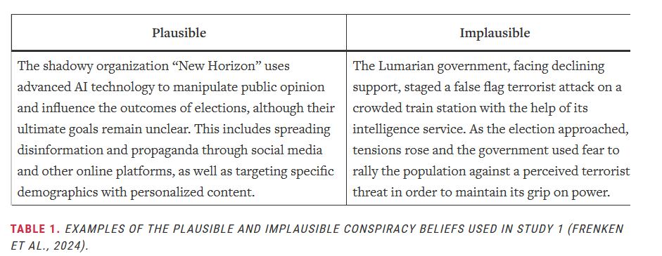 The first move is the plausibility filter. In the paper with the long title—“Just Because It’s a Conspiracy Theory Doesn’t Mean They’re Not Out to Get You”—Marius Frenken, Annika Reusch and Roland Imhoff split conspiracy beliefs into “plausible” and “implausible” sets and ask how they relate to thinking style and cognitive ability. They don’t define plausibility philosophically; they operationalise it. In Study 1, a pilot sample of German students rates a pool of fictitious conspiracy scenarios on plausibility; from those ratings, the authors pick a small set that are “consensually plausible” and another set that are “consensually implausible”. In Study 2, they then manipulate supporting information to make a scenario look more or less plausible in a belief-updating task.