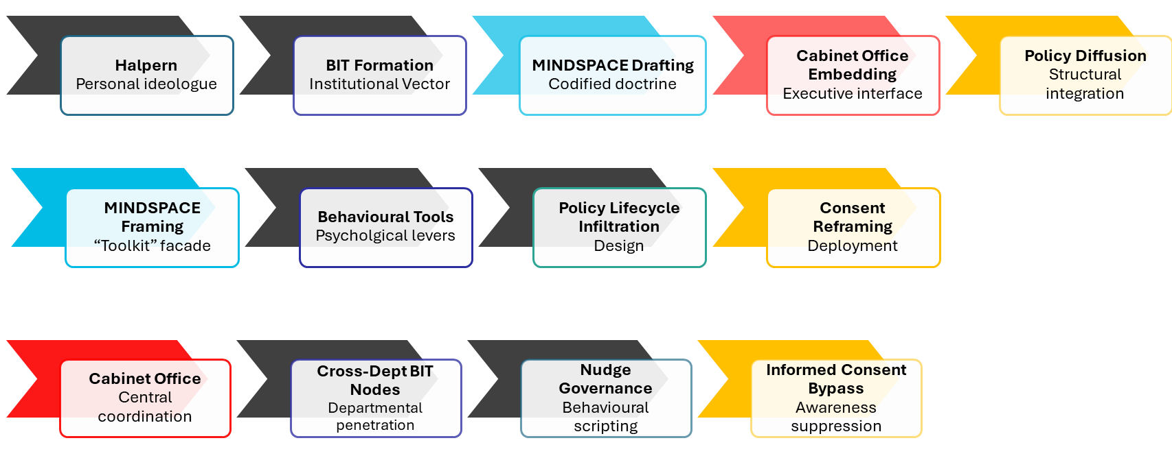 By 2010, the ideology was institutionalised. The Behavioural Insights Team (BIT) and the MINDSPACE framework translated theory into government infrastructure. Psychological control became standard protocol. Public health was reframed not as a dialogue, but as interface management. Governance became behavioural design.