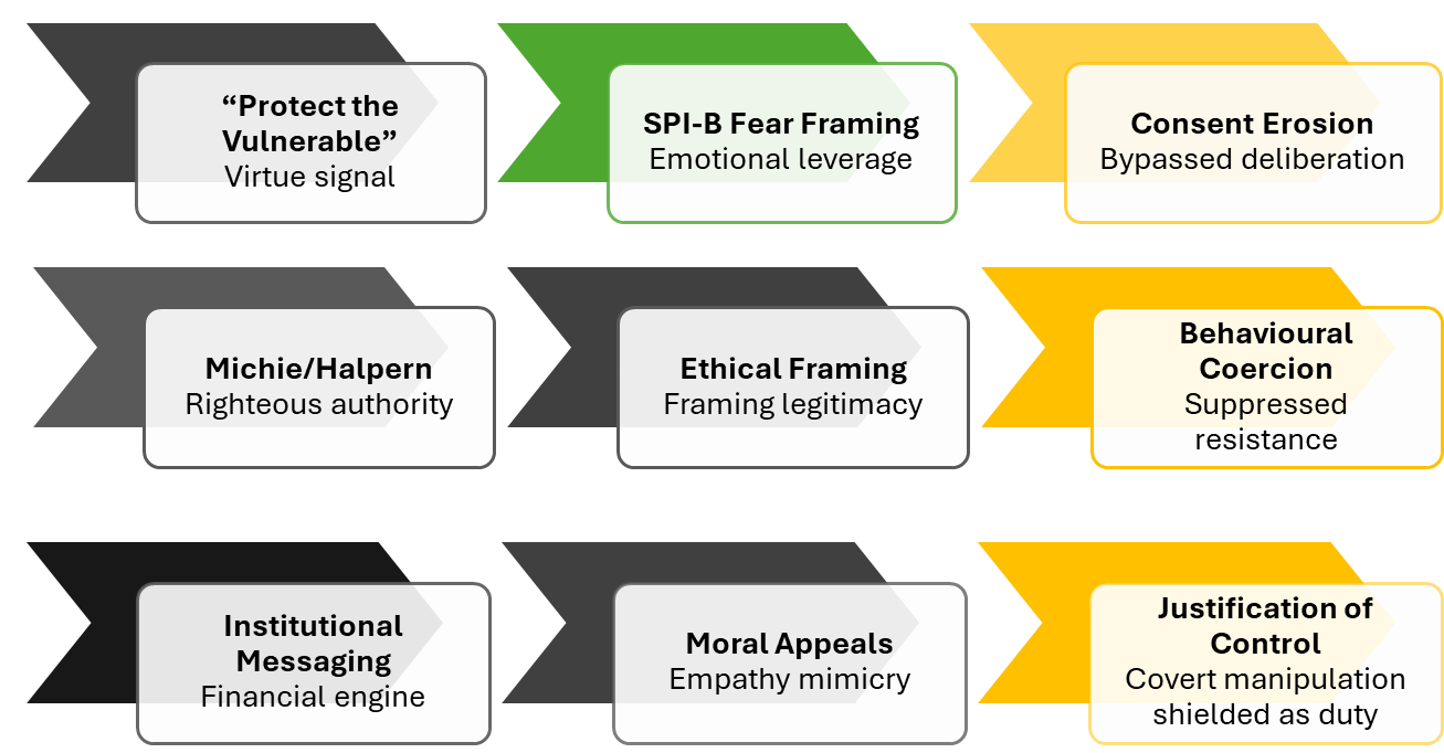 Emotionally resonant language of care, urgency, and duty forms a cognitive firewall around coercive behavioural design—rendering manipulation immune to scrutiny. What should trigger democratic deliberation instead becomes unchallengeable obligation.