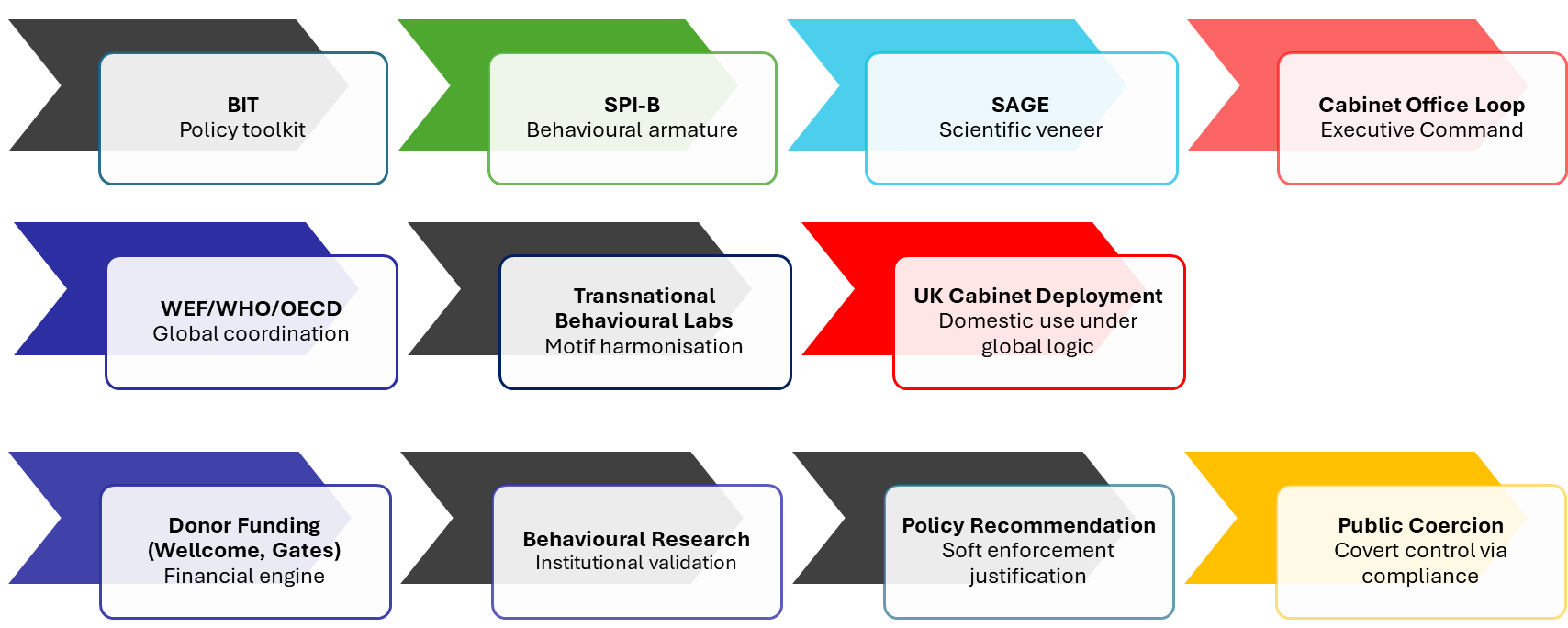 The scripting mechanism so developed is globalised via institutional convergence. Entities such as the WHO, WEF, and OECD serve as harmonisers—replicating UK-origin behavioural models and validating them under scientific and humanitarian veneers. Behavioural control thus gains not just national deployment but transnational legitimacy, backed by donor-funded labs and international think tanks.