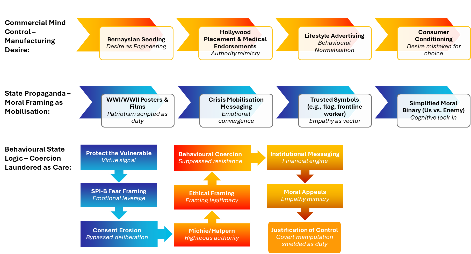 The behavioural governance structures now embedded in public policy did not arise from nowhere. They are the convergence of two enduring architectures: commercial persuasion and state propaganda. One engineered desire. The other mobilised obedience. Their merger didn’t just influence behaviour—it redefined reality.