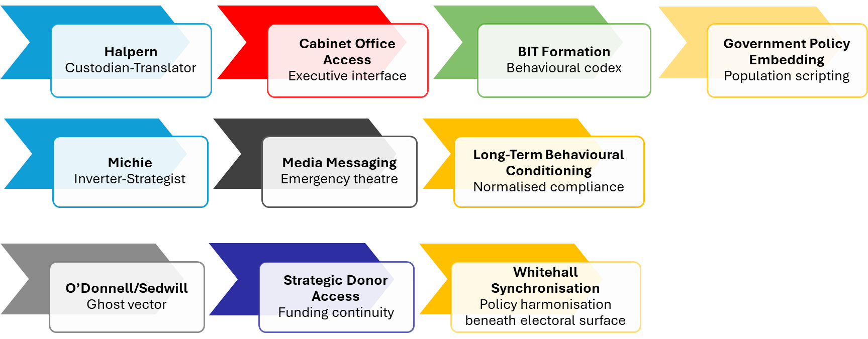 Figure 5 details the functional topology of this vanguard. Halpern operates as the translator from theory to tactical script. Michie curates the inversion logic—public health into behavioural design. O'Donnell and Sedwill maintain narrative stealth, using their administrative authority to cloak behavioural interventions in procedural neutrality.