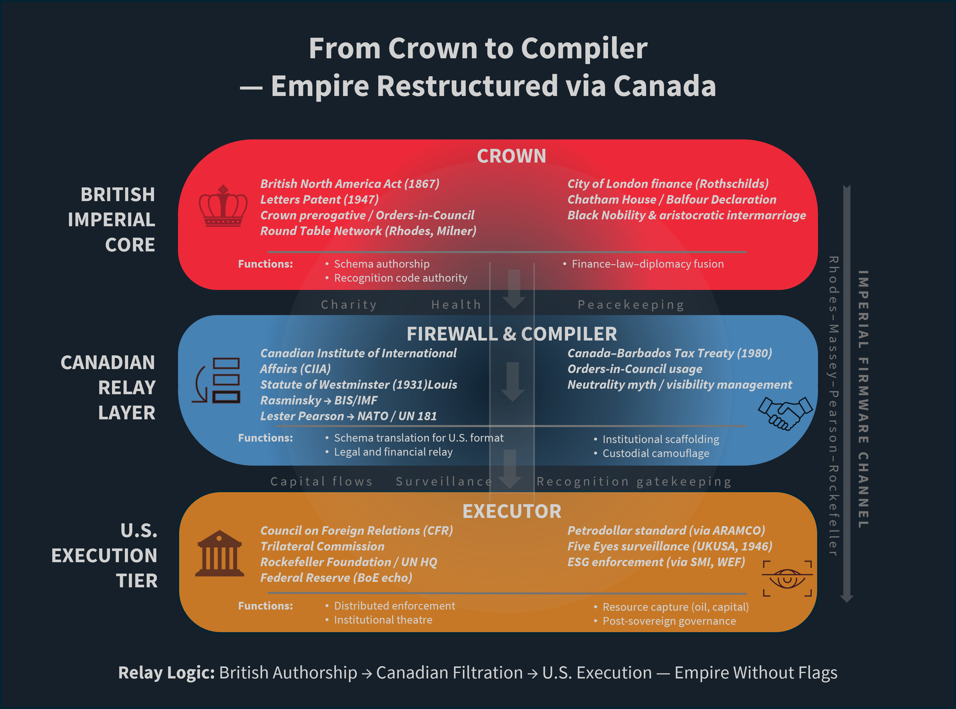 Canada functioned not as a middle power but as a schema transcriber—a conversion layer through which British-coded governance could be recompiled for U.S. scale and application. Its jurisdiction offered legal deniability, cultural proximity, and Crown continuity—permitting imperial re-entry without military confrontation. This duality defined Canada’s strategic role: as custodian of Crown sovereignty within the Commonwealth through explicit legal anchoring, and as translator of British-coded governance into U.S. institutions under the guise of transatlantic cooperation.