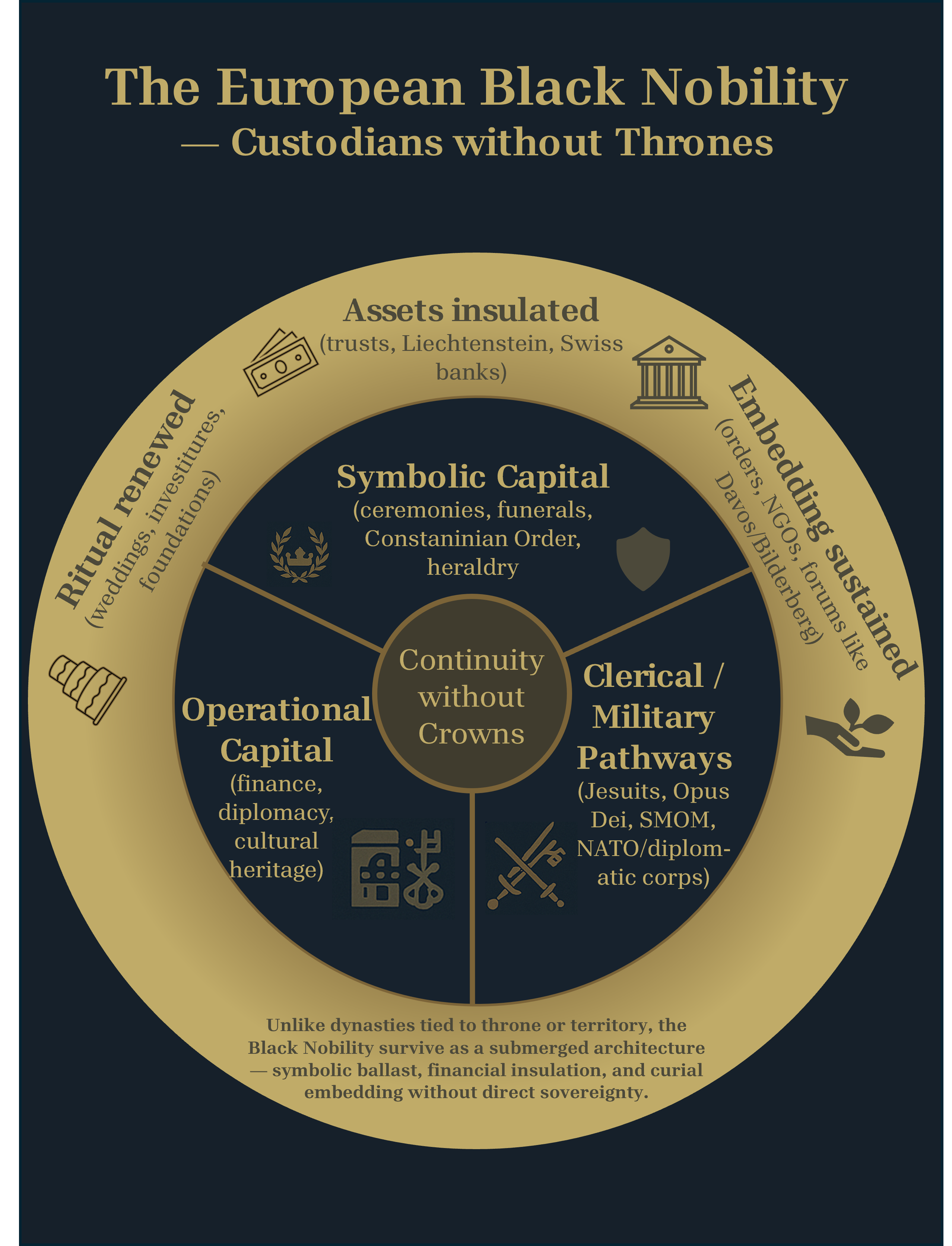 The Black Nobility’s horizon lies in mutation, not restoration. Their comparative advantage is continuity without crowns — names that certify legitimacy for regimes and projects seeking ballast. Mutations follow epochal lines: monarchy → magnate, estate → fund, crown → order, ritual → philanthropy. Their current vector is integration into technocratic custodianship: EU cultural identity, Vatican-Atlantic diplomacy, global philanthropy. The model remains Constantine’s: absorb myth, stage theatre, institutionalise authority. As long as assets are shielded, ceremony reproducible, and convening seats guaranteed, Europe’s Black Nobility will persist — dynastic capital without thrones, submerged continuity still operative beneath the secular surface.