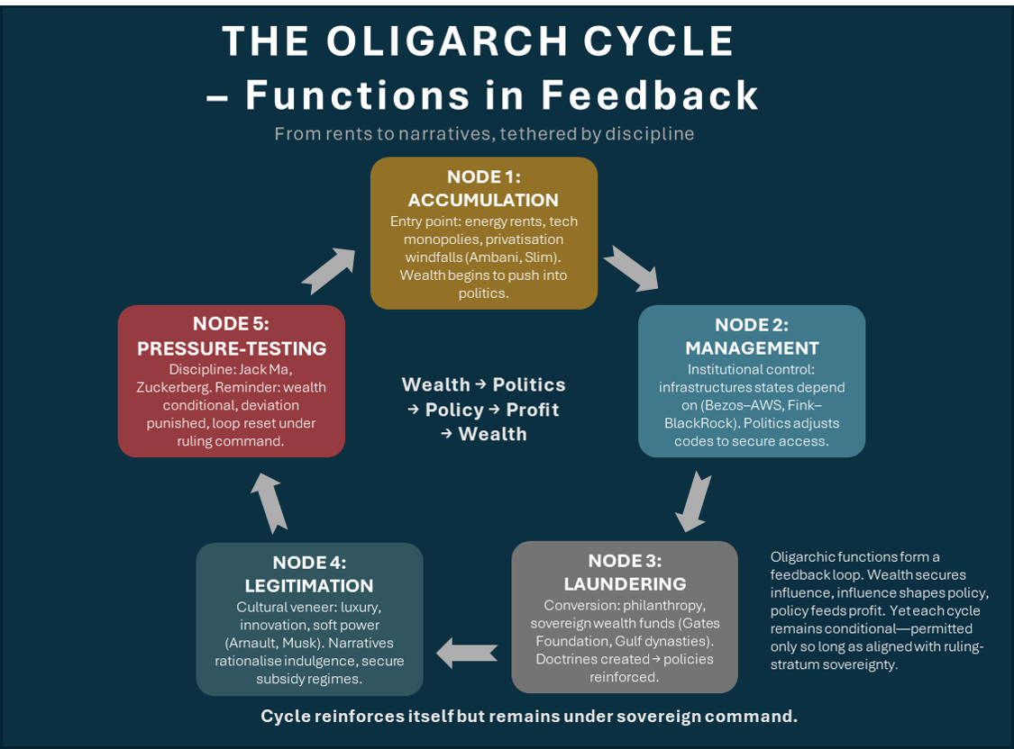 Functions are fixed. Oligarchs operate as extractive nodes (resource rents, data monopolies, pharmaceutical cartels), legitimisers (philanthropy, cultural sponsorships), symbols (entrepreneurial masks), or managers (custodians of capital pools). These roles cycle, but the pattern does not change.