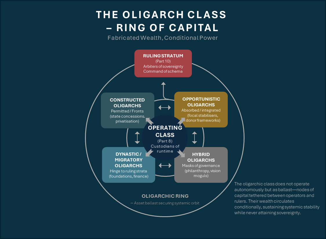The oligarchic class anchors but does not command. They stabilise the system through capital, but sovereignty rests elsewhere—with the Ruling Stratum who set boundaries, admit or exile, legitimise or erase. The myth of the sovereign billionaire collapses here. Oligarchs may front as visionaries, benefactors, or dynasts, but they remain instruments of systemic logic.