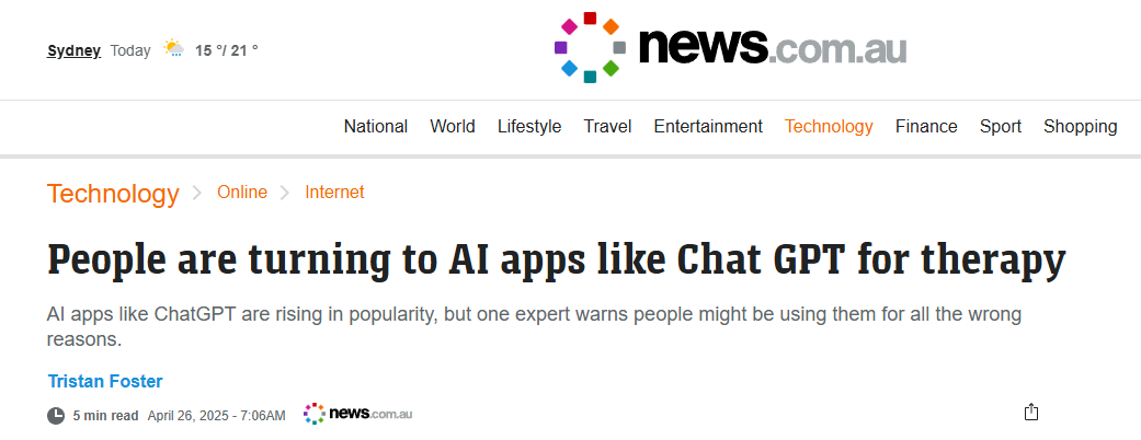 A recent article on news.com.au paints a familiar picture: people turning to ChatGPT and other LLMs for emotional support, guidance, and even trauma processing. They’ve been doing that since the first ELIZA program was created over 50 years ago. But this isn’t journalism—it’s soft cover for a mass behavioural experiment already underway. Under the Technika lens, this isn’t a story about innovation or accessibility. It’s a case study in strategic pacification.