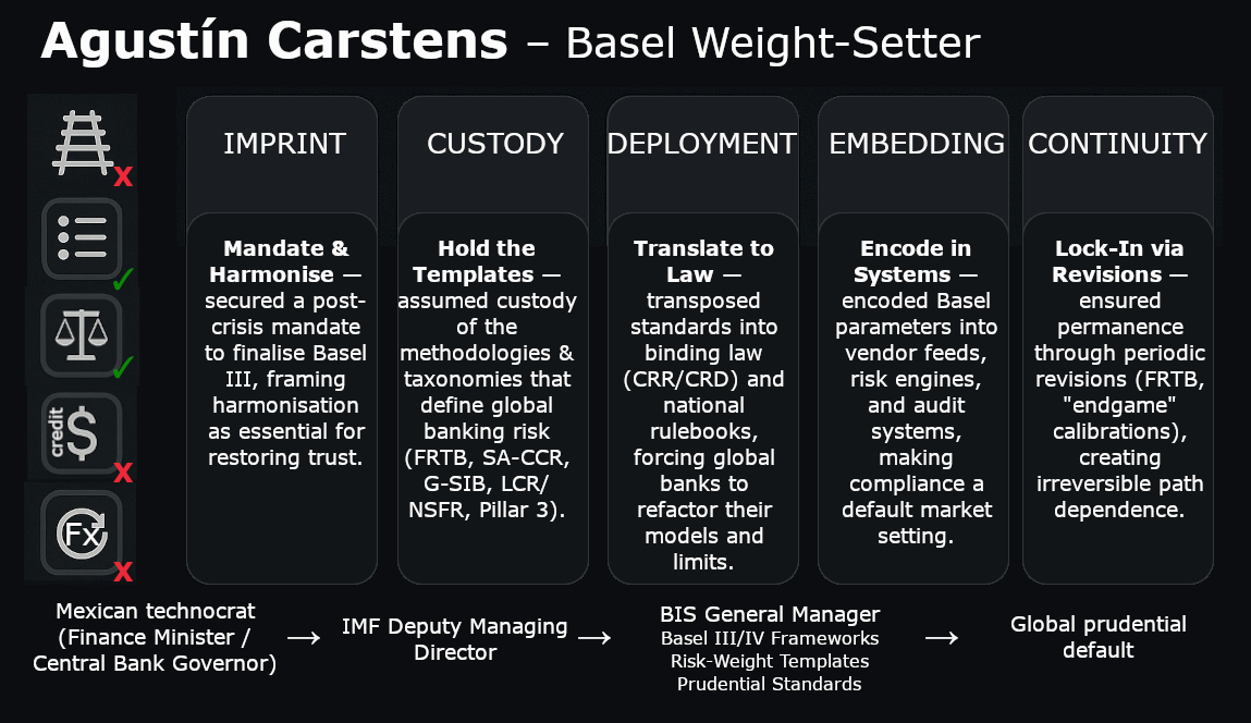 The receipts are Basel consultation papers, leverage schedules, peer review reports. These are not glamorous, but they control more credit than any speech. The Basel Committee is framed as consensus, but in practice it is codification. Carstens’ career proves the point: Weight is global law when markets internalise it, and governors enforce it through templates, not parliaments.