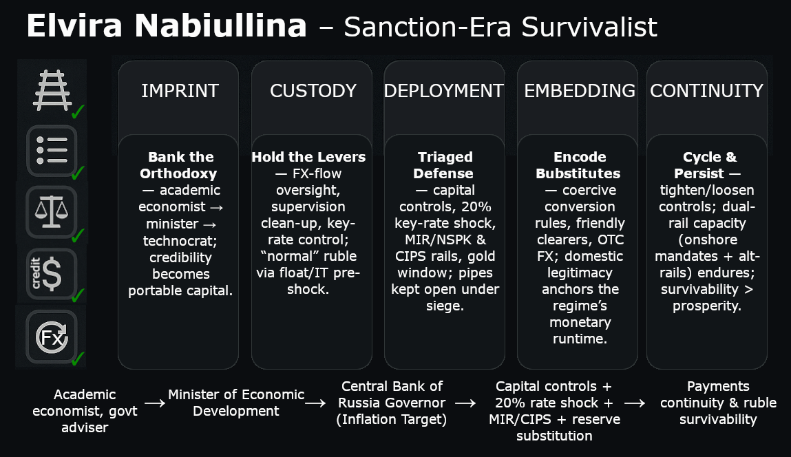 Ostracised from Western forums but indispensable at home, she translates sanctions into workable substitutes: exchange controls, friendly clearers, coercive conversion rules. The embed is within Russia’s elite: technocratic credibility recycled into regime survival. The ruble survived not by orthodoxy but by bricolage: exchange controls, friendly clearing partners, coercive conversion rules.