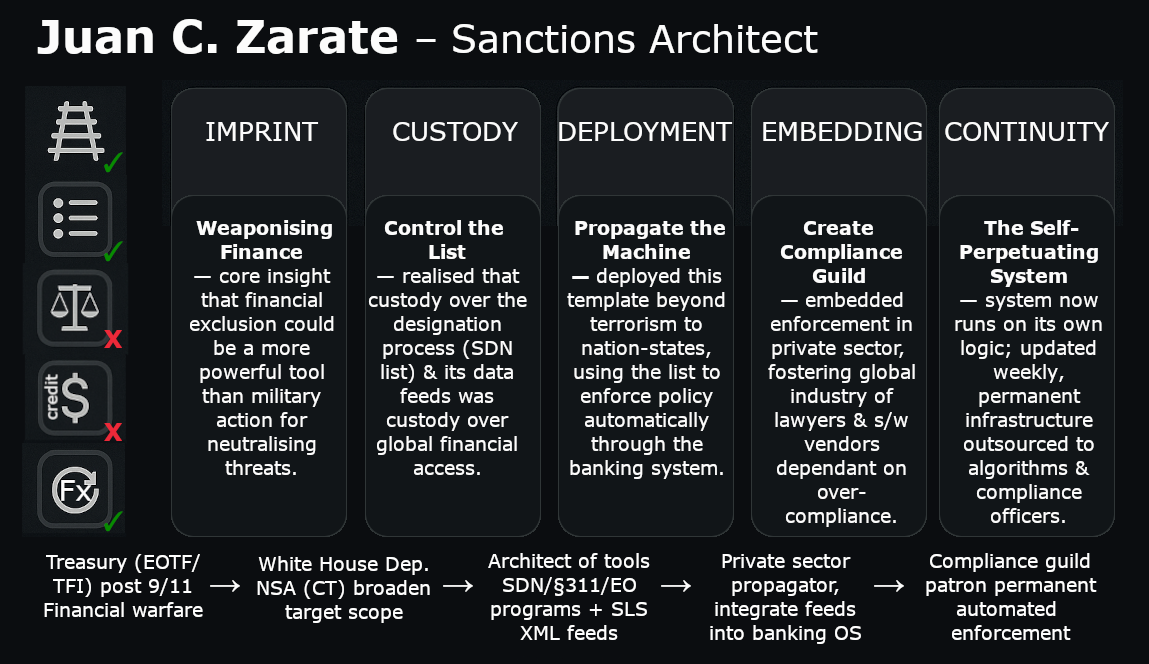 Zarate’s innovation was procedural—convert foreign policy into machine-readable exclusion. Once a name was tagged, banks’ compliance engines did the work. Sovereignty was enforced by XML, propagated through risk software and de-risking culture.