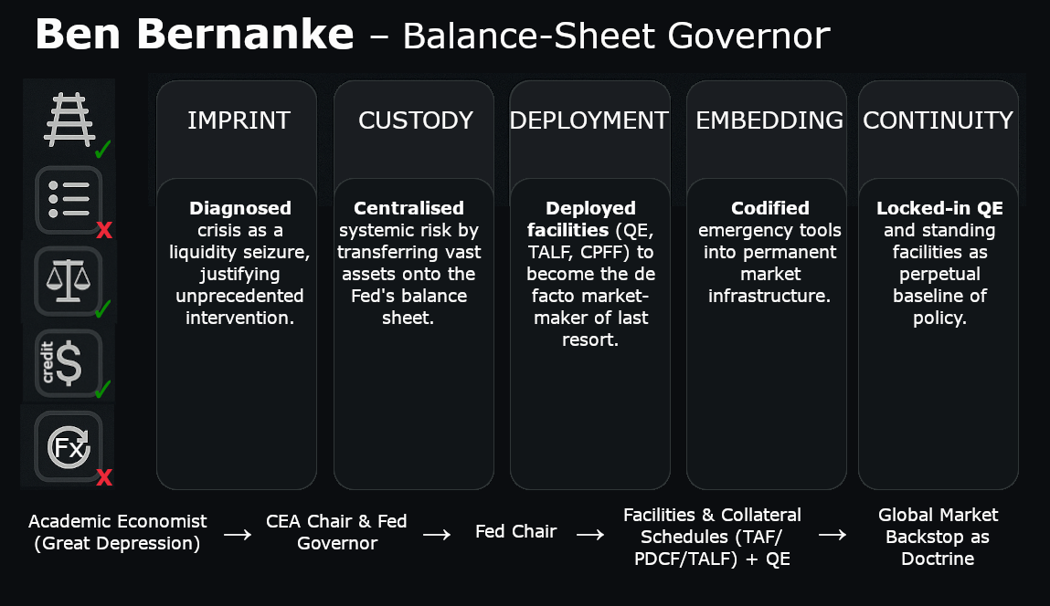 This origin mattered. When crisis hit in 2008, Bernanke was not improvising; he was applying a model in which liquidity supply was the cure for systemic breakdown. His imprinting phase fixed the operator function: stabilise through balance-sheet expansion and collateral policy.