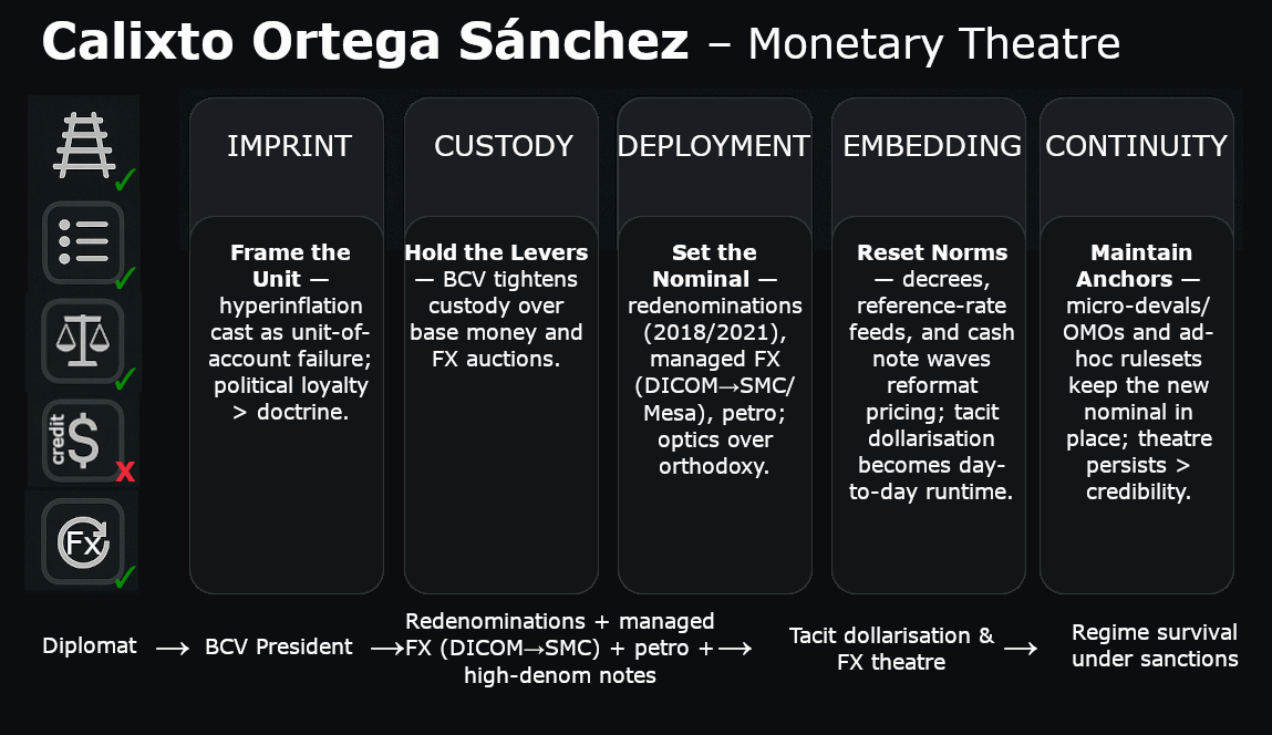Ortega shows how the operator function mutates: technocrats engineer credibility; collapse governors engineer theatre. His runtime wasn’t to fix the bolívar but to preserve the appearance of a state—dollarisation and barter ran the real economy while the BCV staged symbols. The receipts—redenominations, new notes, petro decrees—didn’t restore stability; they sustained the regime narrative: monetary authority as spectacle after substance.