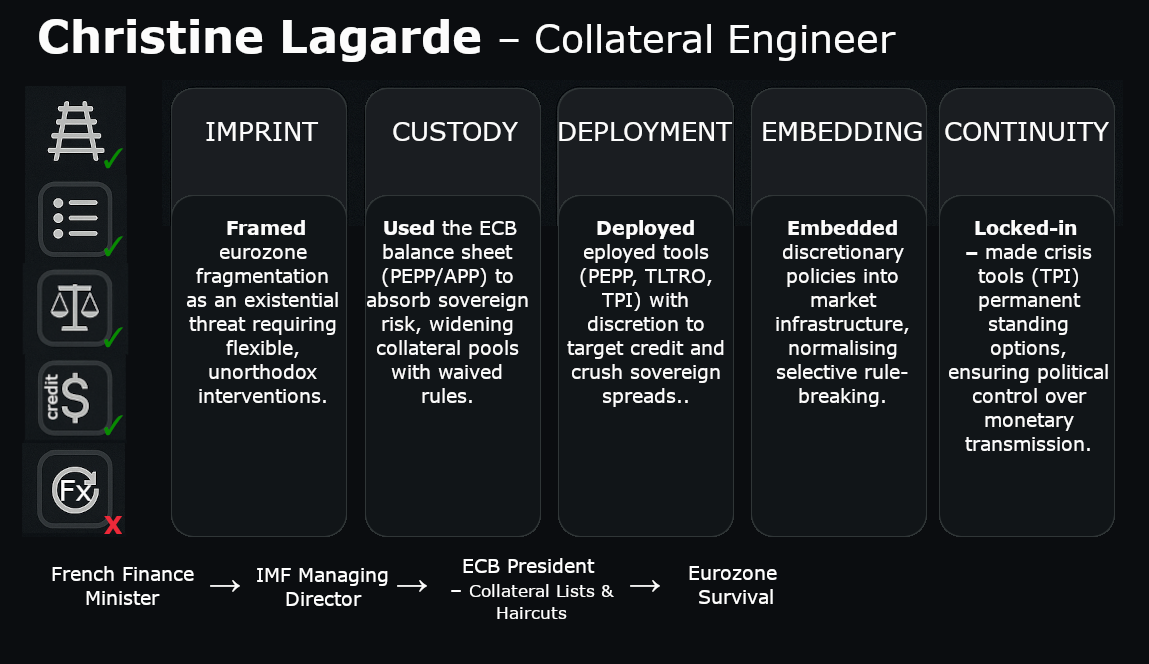 Appointed ECB President in 2019, Lagarde entered a role traditionally dominated by central bankers. But her function was distinct: she was not a monetary theorist but a rail operator, governing the collateral framework that underpins the euro system.