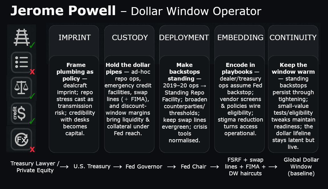 Crisis might have discredited him, yet Bernanke’s credibility only grew. The Fed’s role as market backstop became permanent, despite political opposition. The artefacts—repo eligibility, swap-line terms, QE templates—became model defaults. Even critics accepted them as permanent baseline.