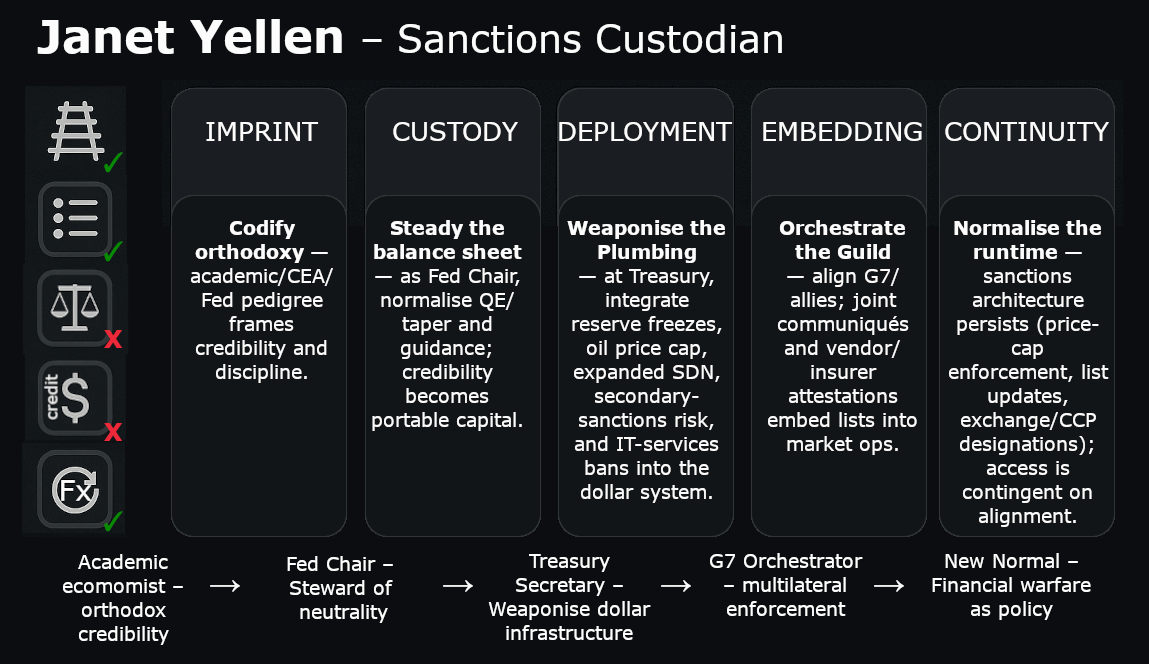 Yellen operationalised the dollar not just as reserve asset but as a coercive lever—turning a “neutral” system into conditional access. She didn’t invent the toolkit; she scaled it: reserve freezes, the oil price cap, and G7-runtime coordination that weaponized market plumbing. Her Fed-bred orthodoxy supplied cover to normalize extraordinary acts and make reversal unlikely. The receipts aren’t papers but sanctions directives, joint communiqués, and price-cap guidance—orthodoxy repurposed to sell rupture as continuity.