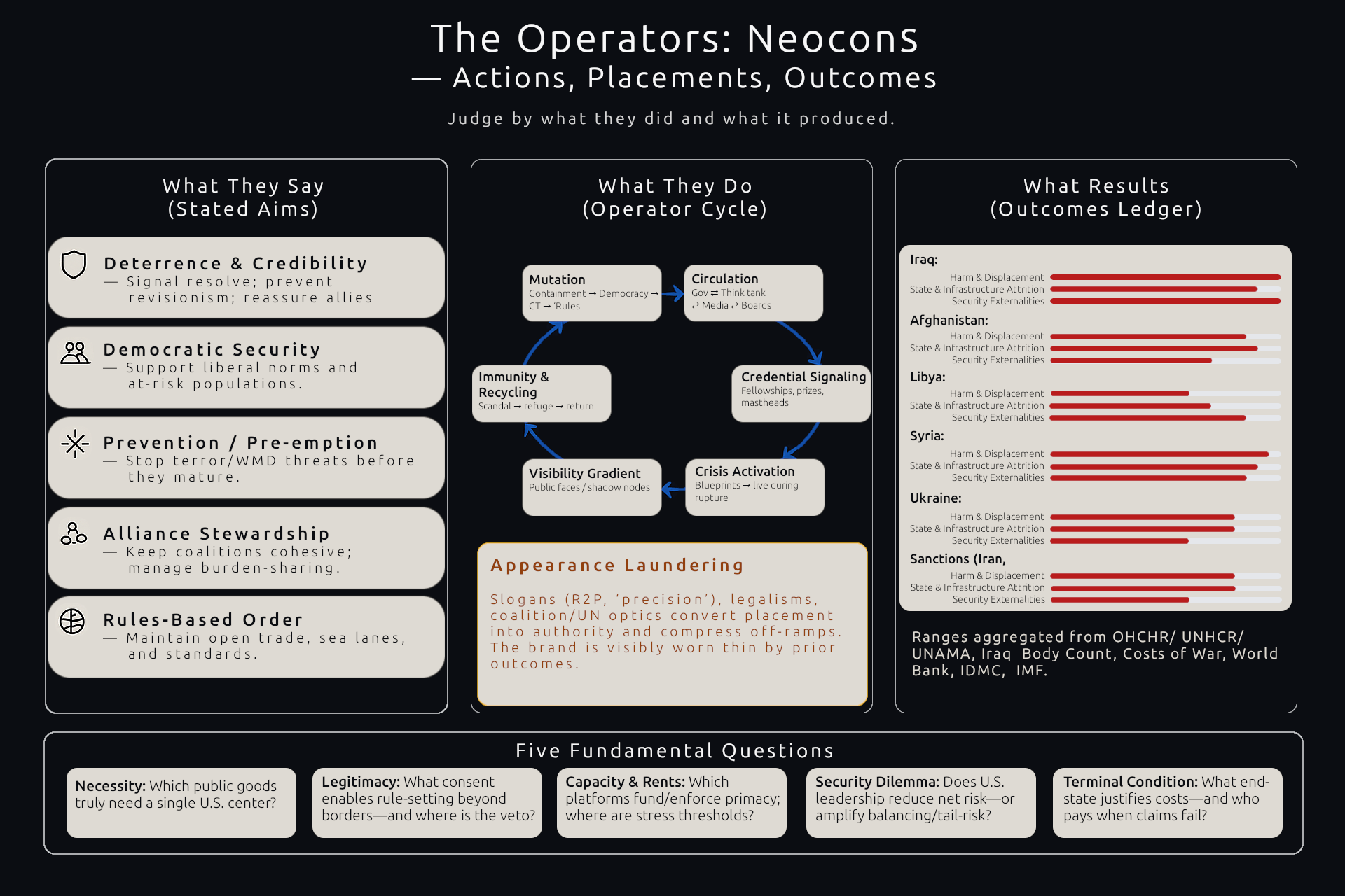This article has treated the neocon cohort on two ledgers: stated aims (deterrence, alliance reassurance, democratic security, rules-based order) and recorded effects (placements that convert those aims into enforcement defaults under crisis).